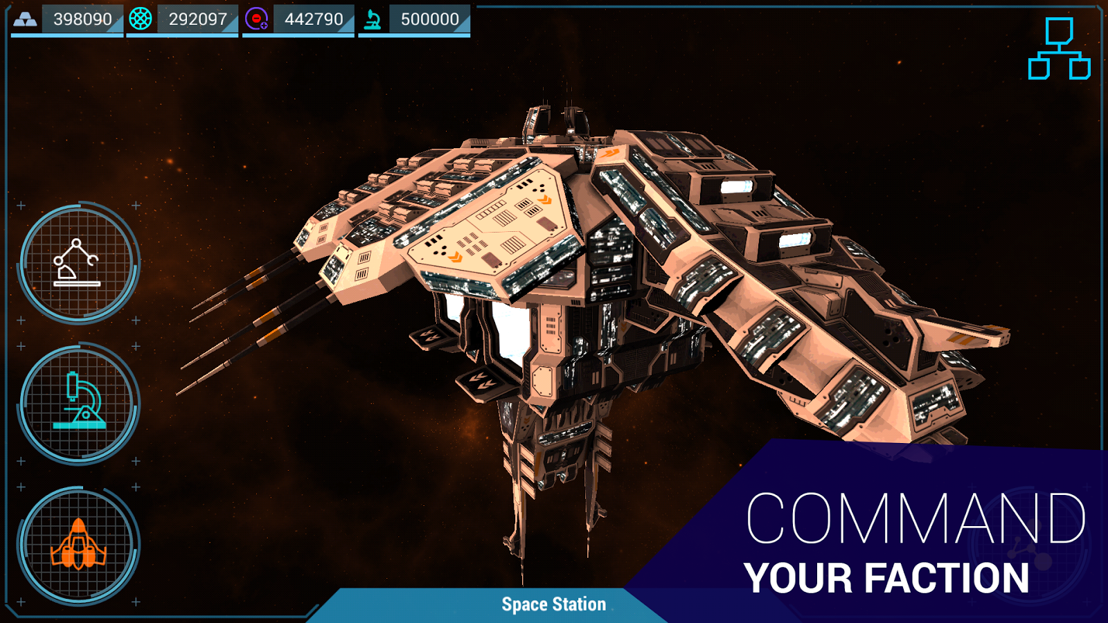 Fight with different opponents. Each faction has its own tactics and technology stack, so you should plan your fleet equipment carefully.