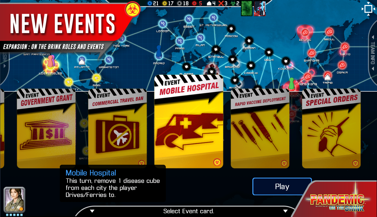 At the end of every player’s turn, new cities are infected with disease cubes and Epidemics may arise. You must fight to prevent the outbreaks before they spin out of control.
