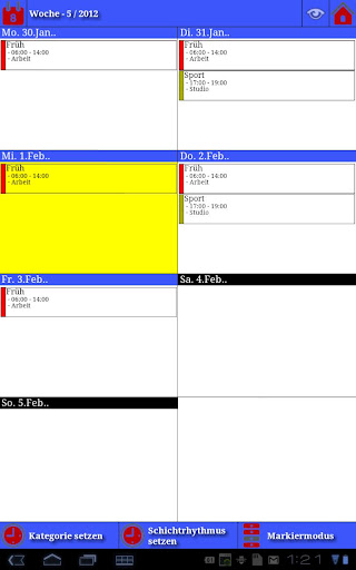 Setup categories that will serve as templates to be easily used when entering shifts later on. You can even combine several categories to a more complex work schedule. Different kinds of counters will help you keeping an overview of shifts, work hours or even resulting salary.