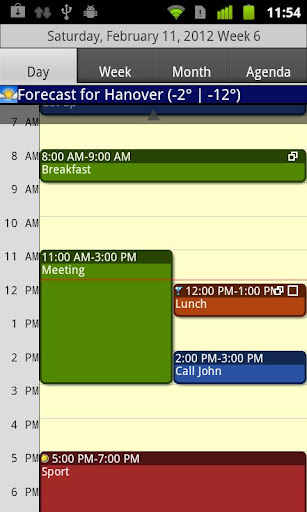 - Widgets to see your events on your home screen without opening the app: day widget (4x1, 4x2, 4x3), week widget (4x3, 4x4, 5x5), month widget (4x3, 4x4, 5x5) and agenda widget (different sizes from 2x1 up to 5x5). In the month 4x4 widget you can tap a single day to directly open it. The agenda widgets can be (optionally) scrollable (but under Android 2.x this requires a special home screen manager).