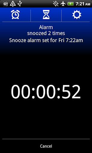 Alarm clock plus timer features include: music alarm, random song alarm, gentle alarm volume ramp up, math to snooze/dismiss, shake to snooze/dismiss, auto-snooze, auto-dismiss, time to next alarm, timer countdown, analog clock widget and much more.