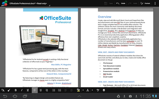 Made by MobiSystems, OfficeSuite Pro allows you to view, create, edit, print and share Word, Excel and PowerPoint files on the go. You can also open attachments and see PDF files on an Android based phone or tablet with our feature-rich mobile office solution.