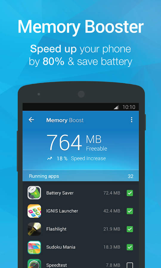 Clean up memory (RAM) and kills background processes / tasks that slows down your device, with one-tap "Optimizer" button. Using memory cleaner will cool down your phone when CPU overheating, boost your phone, and even save your phone from battery draining.