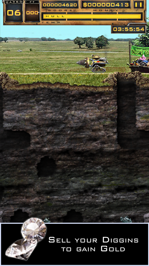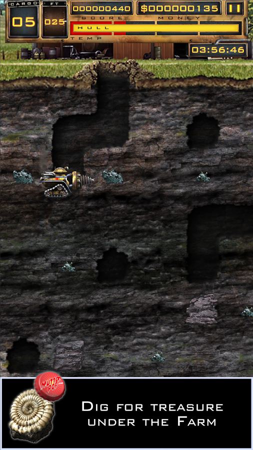 Manage fuel, temperature, and damage while searching for diggins. Sell them at the farmhouse to earn cash. Save cash to pay the mortgage, upgrade your digger, or make repairs. Use the on-screen “analog” joystick, or touch-screen to control digger movement. Watch out for rocks and caverns that disrupt your path. Have fun!