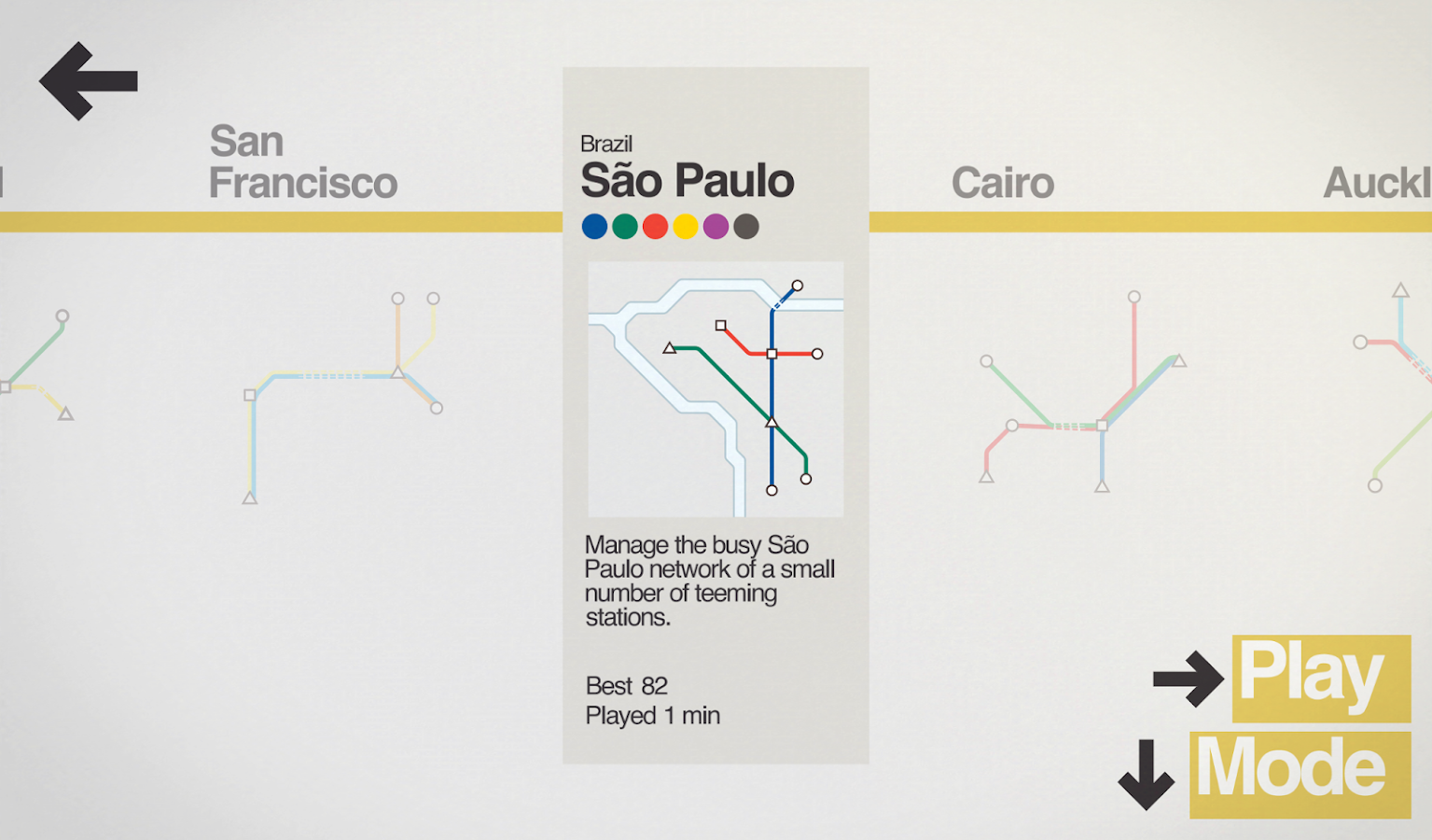 Mini Metro is a game about designing a subway map for a growing city. Draw lines between stations and start your trains running. Keep your routes efficient by redrawing them as new stations open. Decide where to use your limited resources. How long can you keep the city moving?
